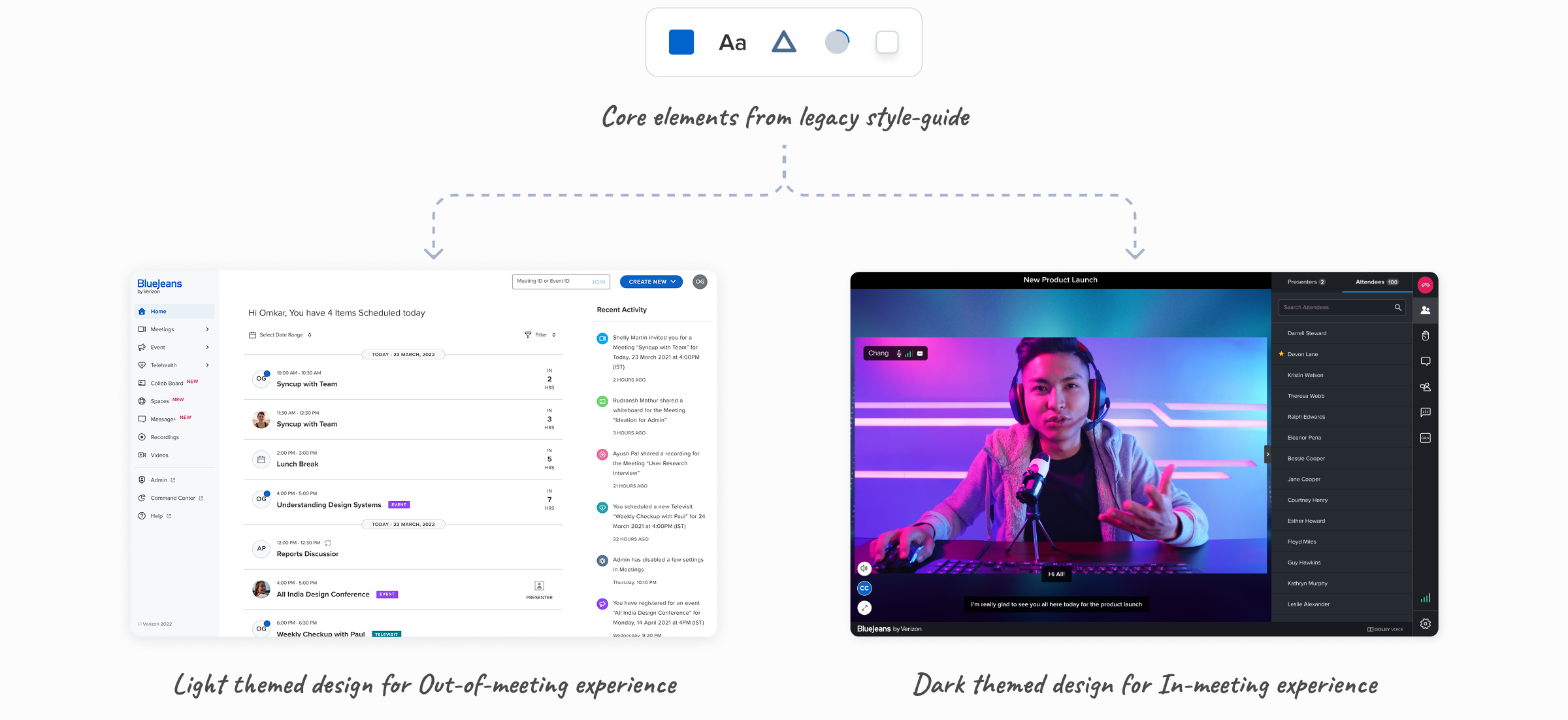 The design system was crafted to align with the ‘Bluejeans’ brand’s visual language, and expanding it into a comprehensive design system. This ensured consistency across all touch-points. Being a video-based product, we followed a dark UI with subtle components, enhancing usability while maintaining brand identity. Content and tone of voice guidelines were also defined to create a unified and engaging experience.
