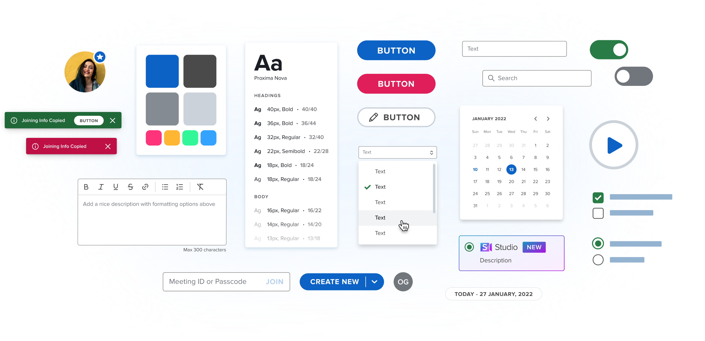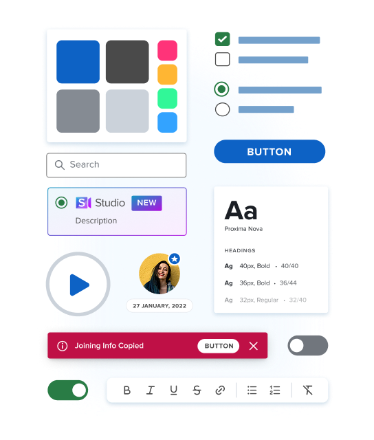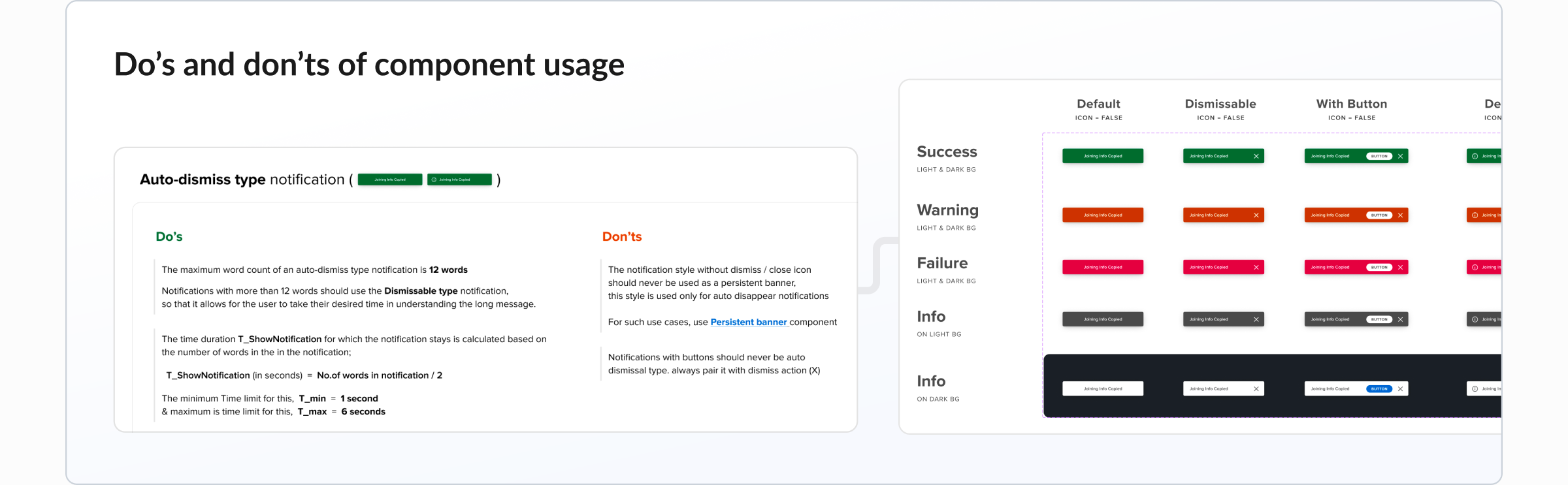 Given the video conferencing product’s broad user base, accessibility was a key focus in both the design and design system. We ensured all colours followed WCAG-compliant colour contrast for readability, alt-tags for all images and icons, careful consideration of keyboard navigation & shortcuts, and screen reader access to follow the appropriate structure & flow. All this ensured that the designs created using the design system offered an inclusive experience for all users.