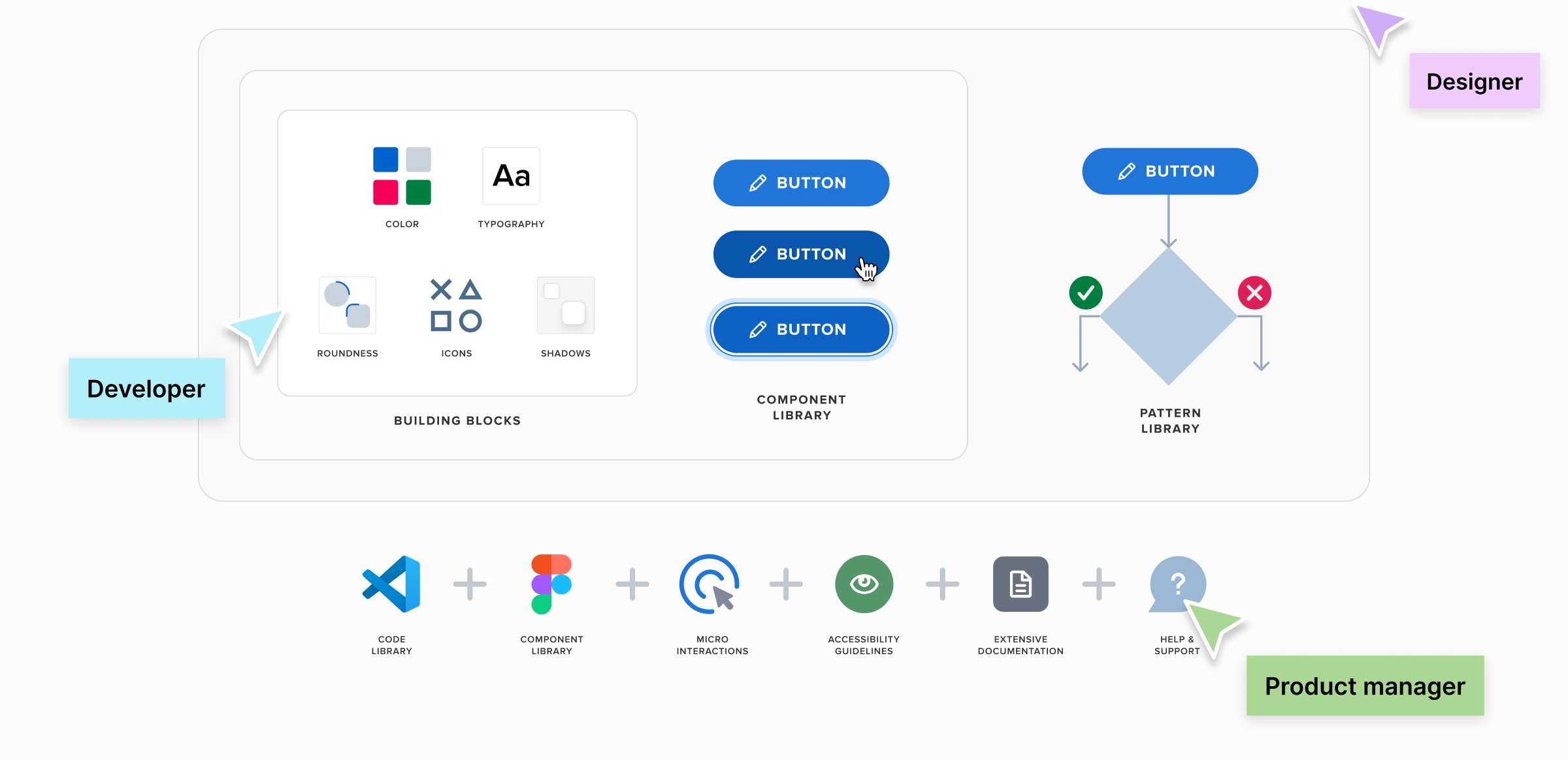 The design system follows Atomic design principles, breaking down UI elements into 4 levels: atoms, molecules, organisms, patterns. This modular approach allows each component to be developed, tested, and maintained independently, making it easier to scale while being consistent and avoiding redundant work.