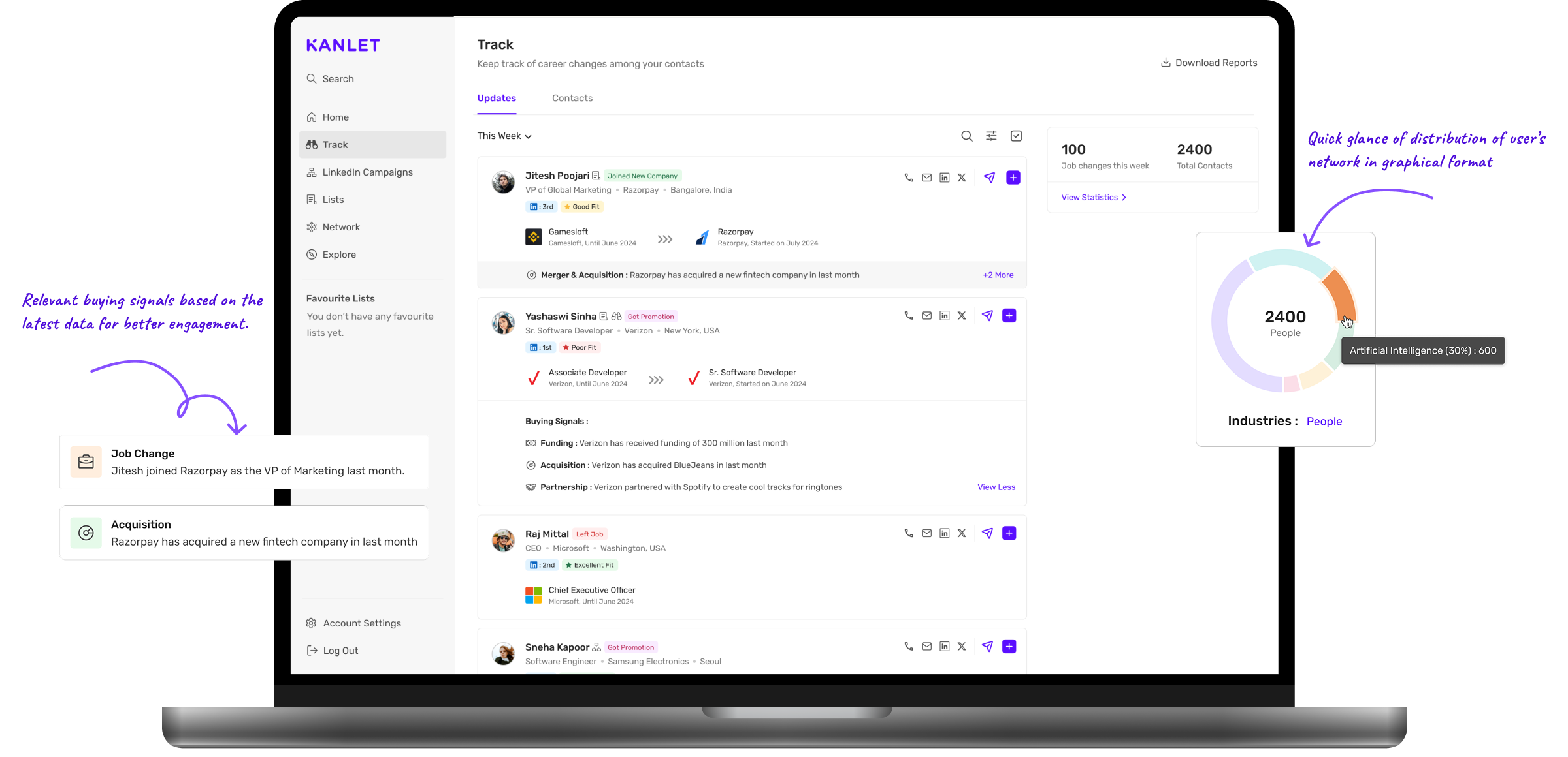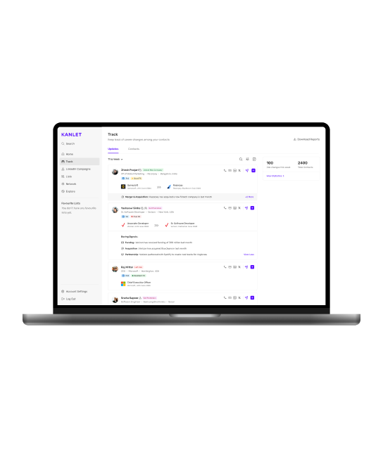 We designed Kanlet’s target list updates to prominently highlight key trigger points like recent funding and mergers or acquisitions, making it easy for users to spot timely opportunities. The interface clearly indicates the nature of each connection—whether first, second, or third degree—providing context for outreach strategy. This dynamic updating ensures users stay informed and can act swiftly on high-impact sales signals.